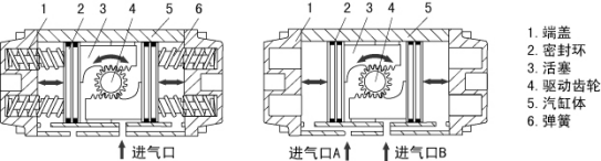 结构形式:双活塞齿轮齿条结构(双作用)或双活塞弹簧复位齿轮齿条结构,具体结构请参见图3及图4